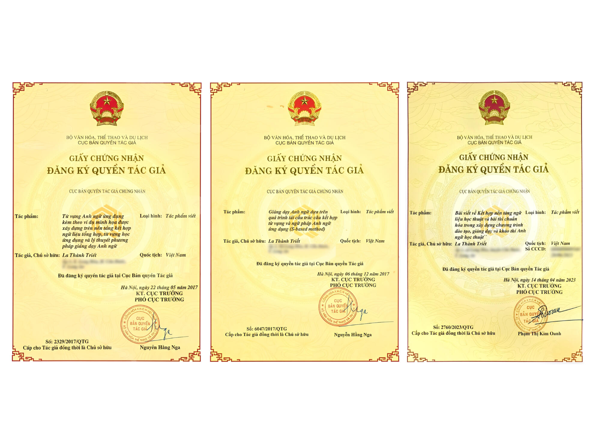 Ông La Thành Triết có 3 công trình nghiên cứu giáo dục ngôn ngữ và giảng dạy tiếng Anh được Cục Bản quyền Tác giả cấp chứng nhận tại Việt Nam từ năm 2017 và được hàng ngàn giáo viên áp dụng thành công trong giảng dạy thực tiễn.
