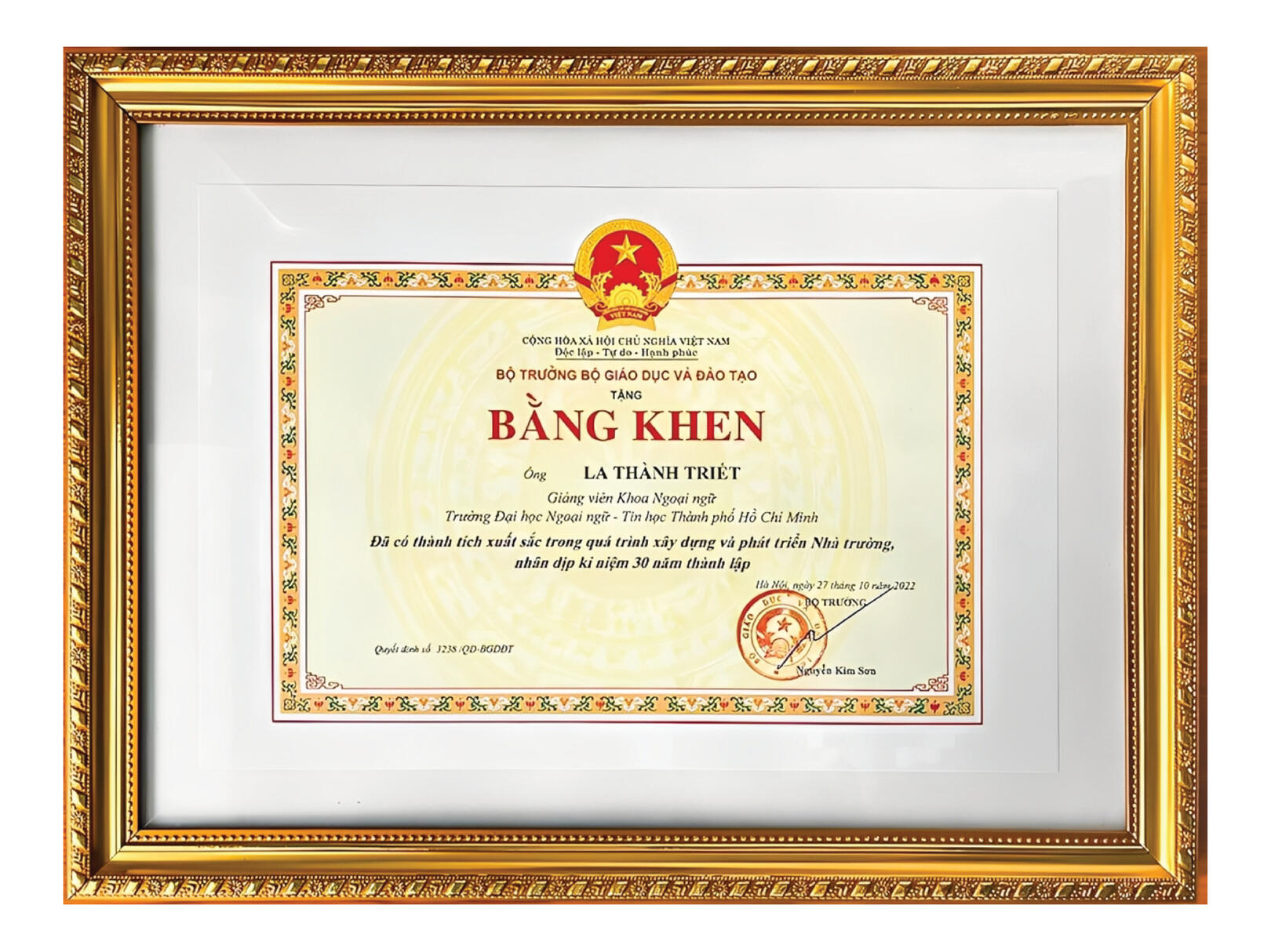 Tháng 11 năm 2022, ông La Thành Triết vinh dự nhận bằng khen của Bộ trưởng Bộ Giáo dục và Đào tạo Việt Nam vì những thành tích xuất sắc trong quá trình xây dựng và phát triển nhà Trường Đại học Ngoại ngữ - Tin học Thành phố Hồ Chí Minh (HUFLIT).